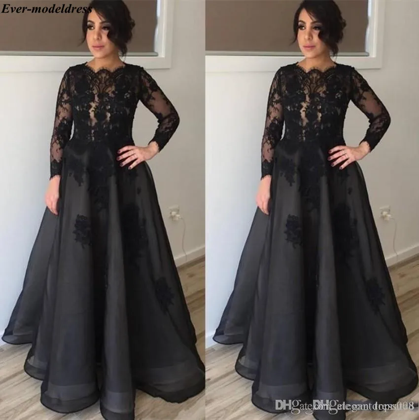 Buy 2019 Black Mother of Bride Dresses Long Sleeves A-Line Floor Length Lace Appliques Button Back Wedd
