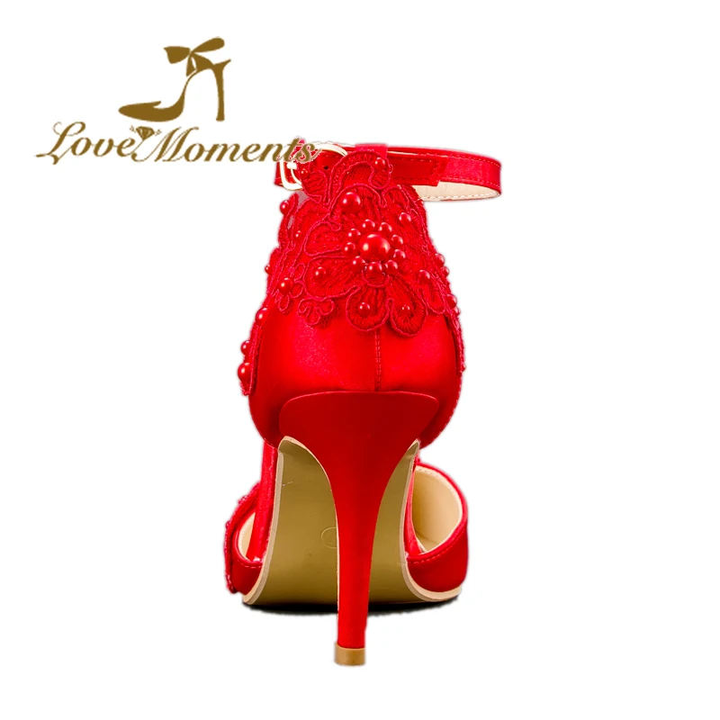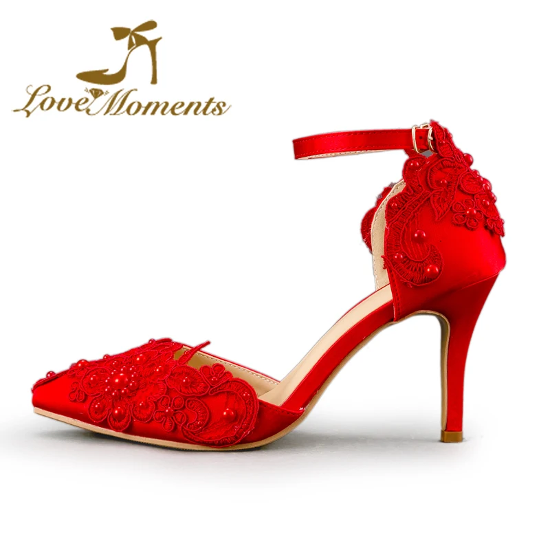 Cheap Sandals High Heel Women Pumps Sexy Red Satin woman wedding shoes pointed-toe Lace bridal pumps dres