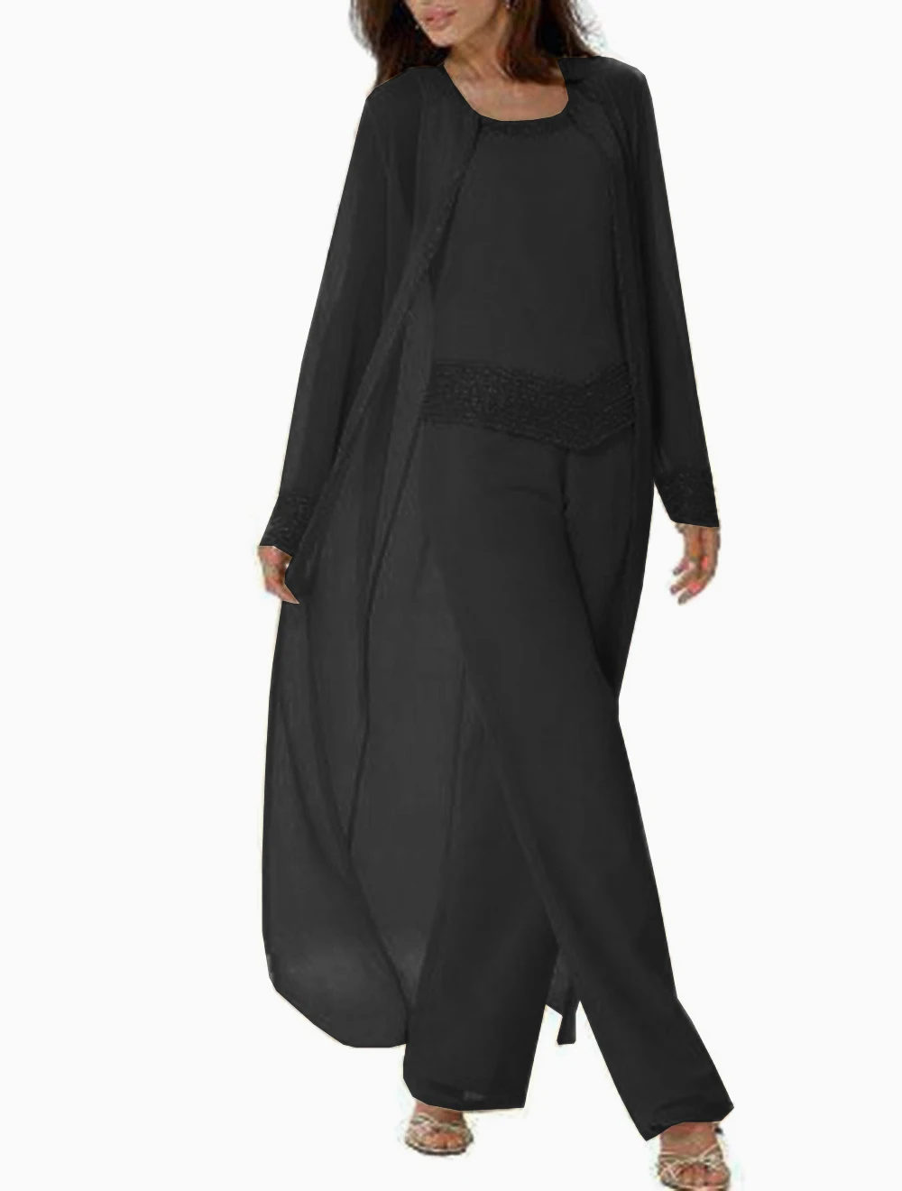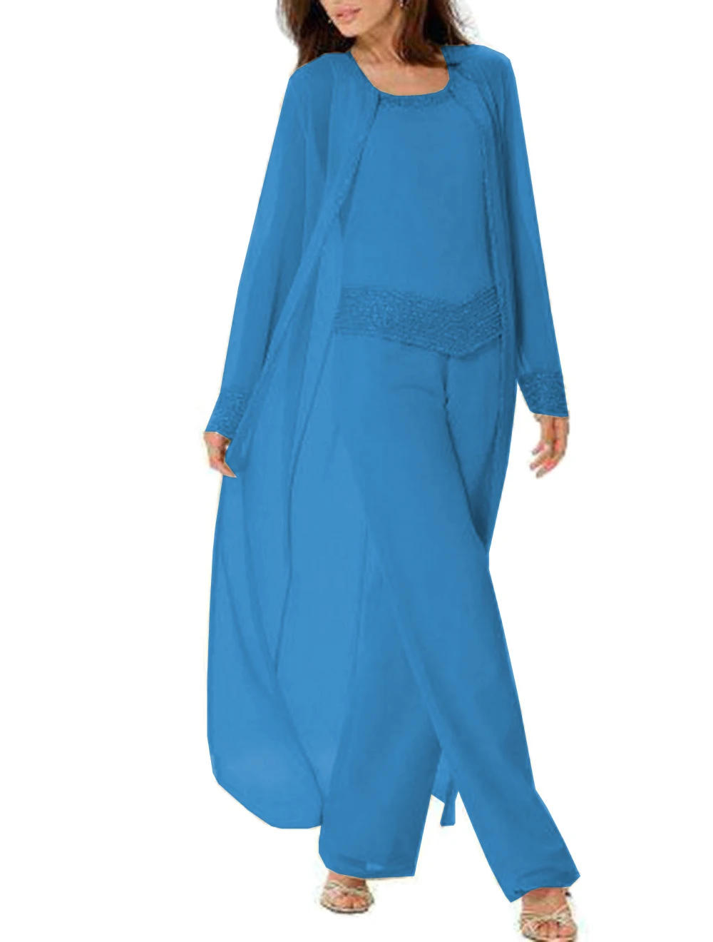 Buy women 3 pieces Elegant Beading Chiffon mother of the bride dress pants suit with long jacket outfit