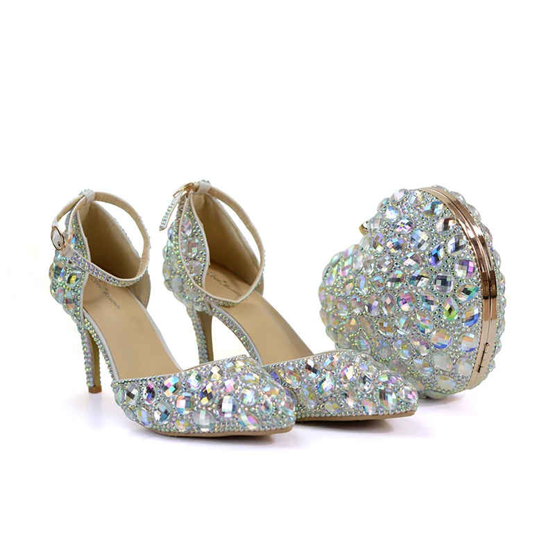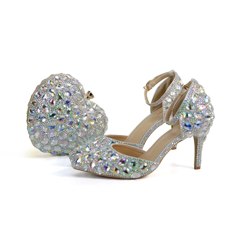 Discount Pointed Toe Bride Wedding Shoes with Matching Bag Blingbling AB Crystal Bridal Dress Shoes 3 Inches