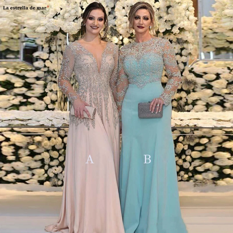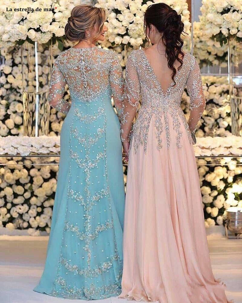 Limited Vestidos para la madre de la novia2019 new lace appliqué beaded chiffon long sleeve pink turquoise