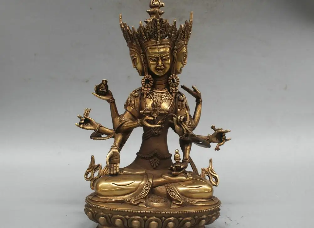 Get 12'' China Tibet Maha Cundi Buddha Mother 3 Head 8 Arms Bronze Statue
