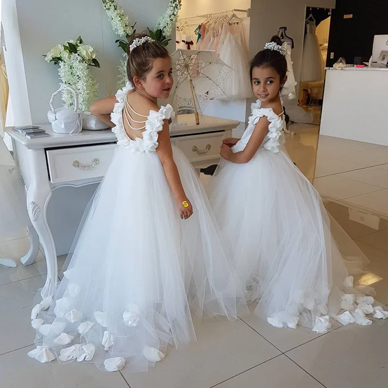 Get Elegant Handmade Flowers Pearls Backless Kids Flower Girl Dresses For Weddings Sweep Train Girls Pr