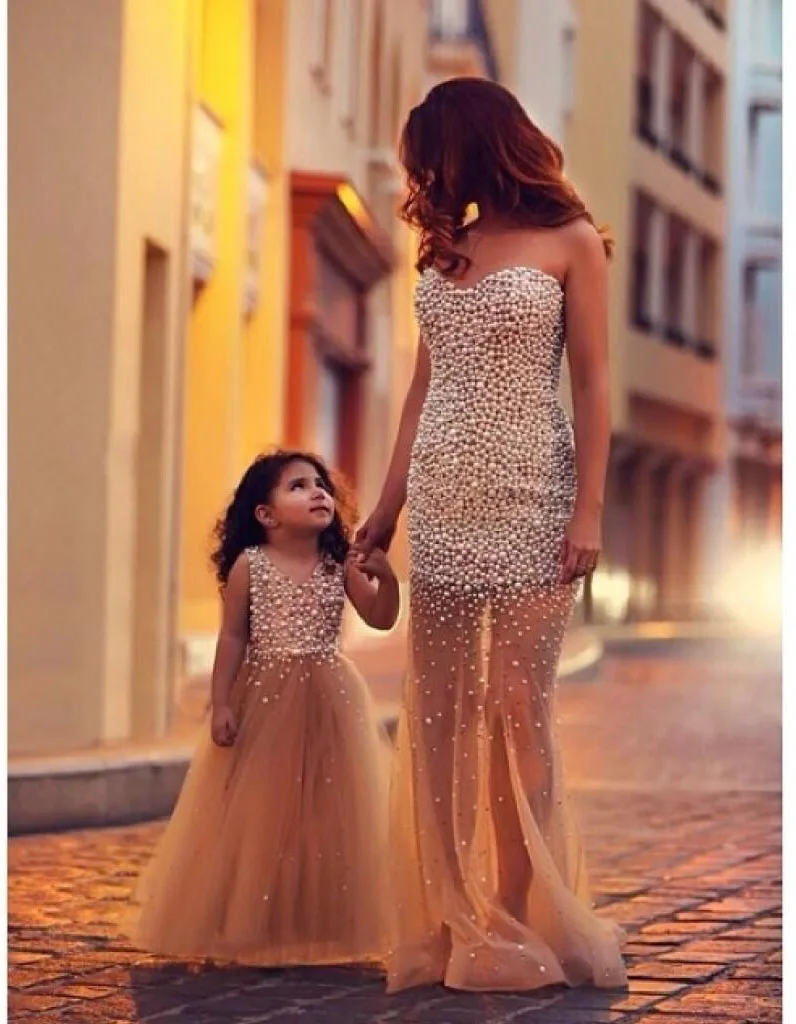 Get Mother Daughter Elegant Dress Rhinestone Pearl Luxury Customize Wedding Dress Clothing Family Cloth