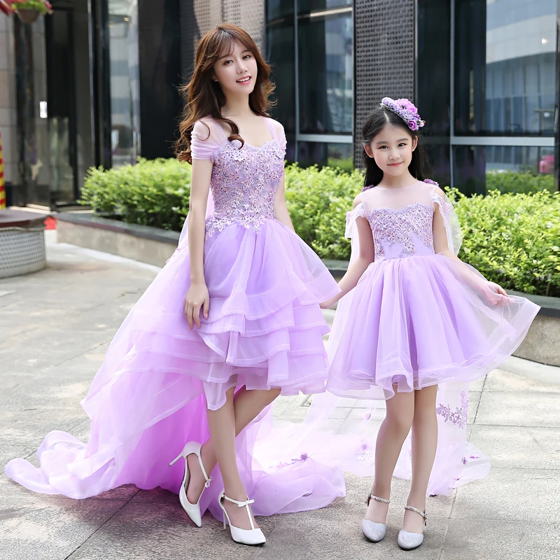Limited Mother Daughter Girls Wedding dress Ball Gown lace Prom purple Mommy and Me Clothes floral tutu ski