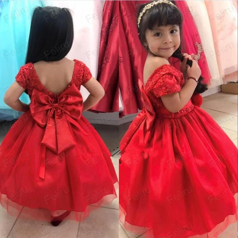 Promo Tulle Short Sleeve Cheap Custom Red Wedding Flower Girls' Dresses Tutu Toddler Little Girls Pageant