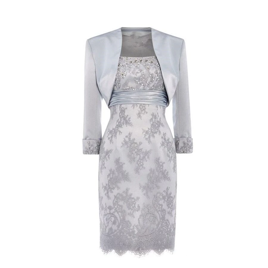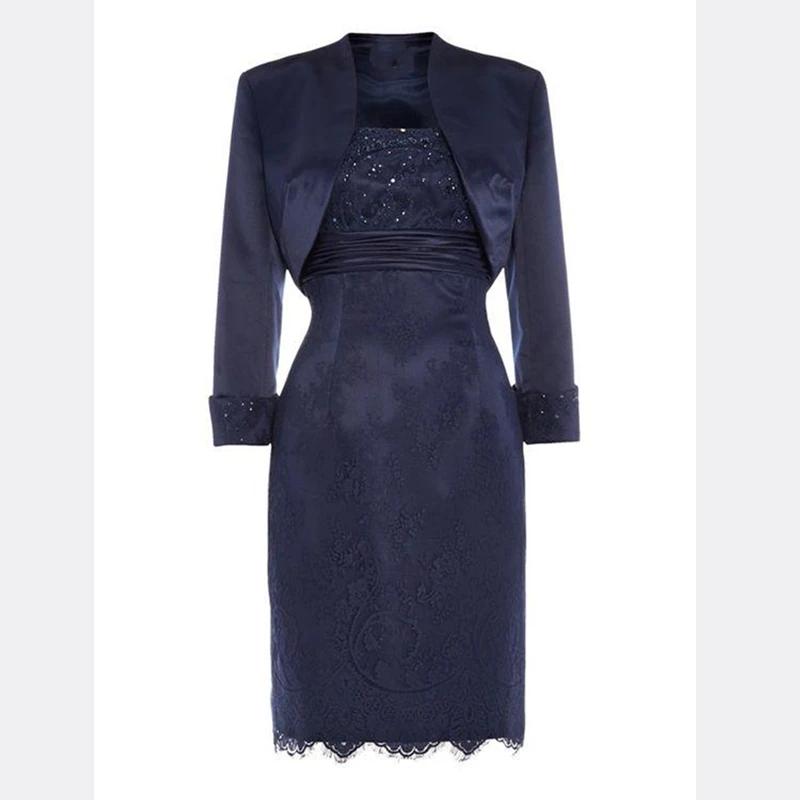 Special Short Mother of the Bride Dress with Jacket Silver Navy Blue Beading Lace Satin Knee Length Formal
